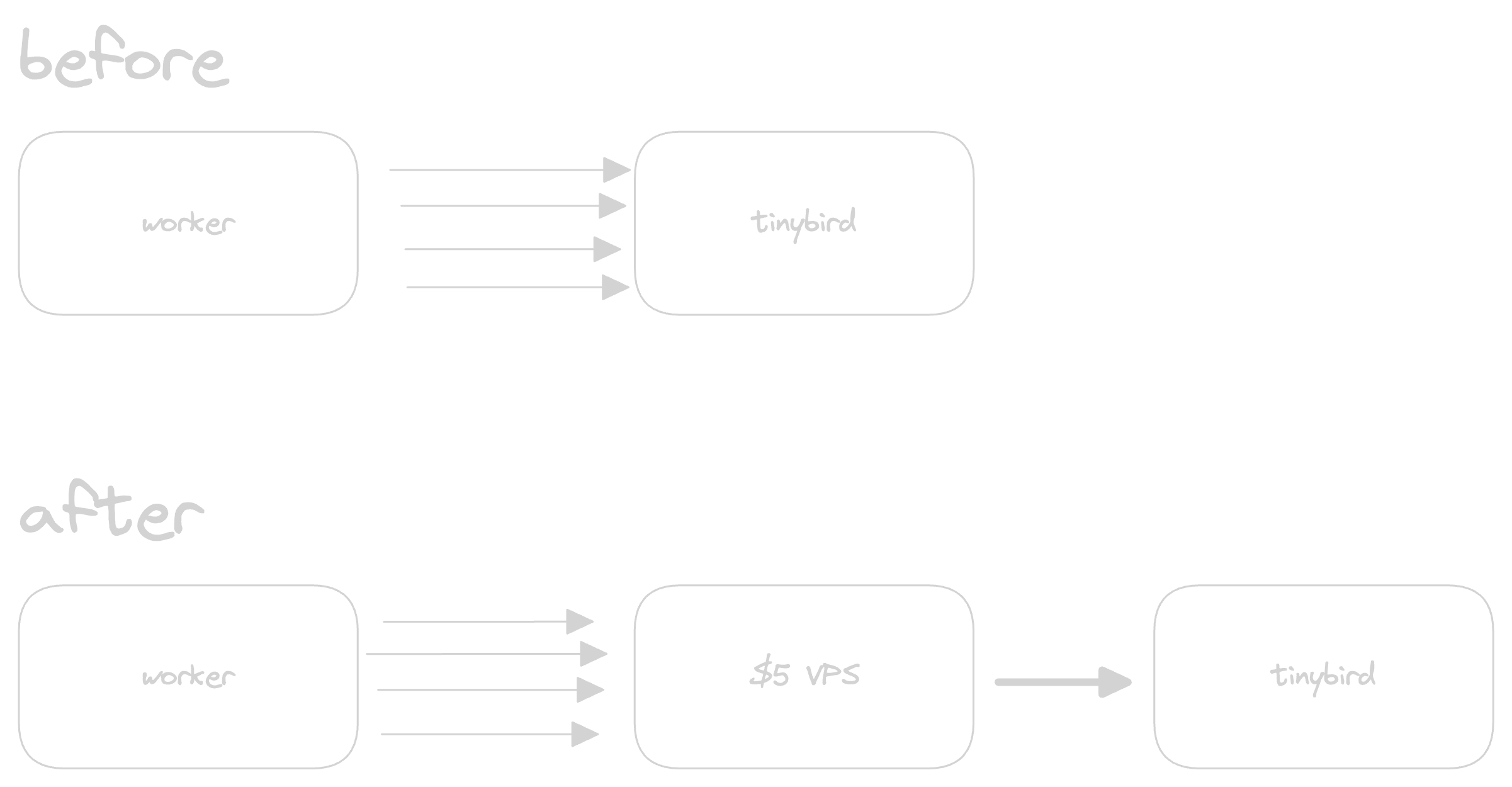 Our API emits multiple different events, such as the outcome of a verification, or a rate-limit being hit. We use Tinybird for all of our analytics, and we were sending each event individually to Tinybird. This is easy on the worker's side because you just fire and forget.